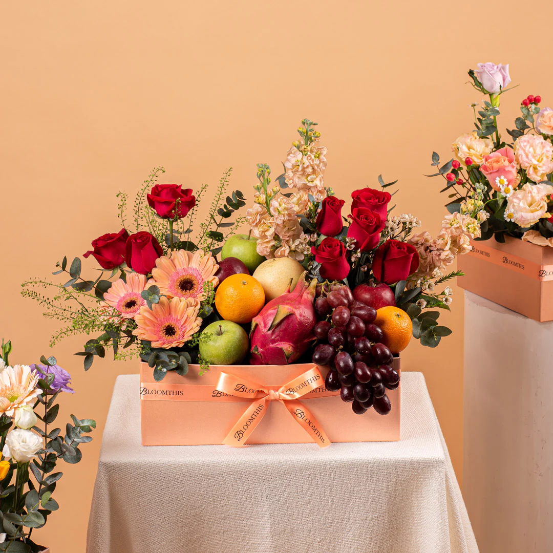 Cheer up your loved one with the Brianna Flowers & Fruit Basket. Champagne gerberas, red roses, and peach matthiolas dazzle amidst a selection of apples, dragon fruit, and oranges. This colourful, flavourful array is sure to lift spirits in a delightful symphony.