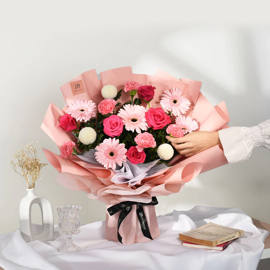 Large: Pink Gerbera (4-5 stalks), White Ping Pong (2-3 stalks), Pink Carnation (4-5 stalks), Hot Cherry Pink Rose (4-5 stalks), Tea Leaf